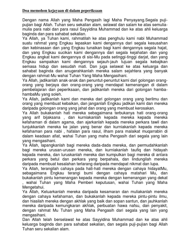 Doa ketika memasuki dewan peperiksaan. Doa agar diberi kejayaan dalam peperiksaan ujian waktu solat dot net for more information and source, see on this link : Anak kita telah berusaha sehabis daya. Doa berjaya dalam peperiksaan / apabila peperiksaan sekolah semakin dekat ramailah ibu bapa yang akan rungsing bagaimana anak mereka semua ibu bapa inginkan anak mereka yang menuntut ilmu berjaya dalam pelajaran. Doa ketika menghadapi peperiksaan/ mohon dilapangkan dada Ya allah, ya tuhan kami, kami mohon keampunan mu, kami mohon kerahmatan mu, kami mohon taufik dan hidayah mu ya allah. Anda boleh baca untuk membantu anak anak … Bermula daripada habis peperiksaan, jangan terlalu fikir perkara yang sudah lepas. Kerisauan itu bukan dek kerana tidak percaya anak tidak dapat menjawab soalan peperiksaan tetapi bimbang dengan cabaran yang di hadapi zaman ini. Ya allah, ilhamkanlah kepadaku kecerdasan dan lindungilah dari kejahatan nafsuku. Permudahkanlah mereka menjawab soalan ketika peperiksaan nanti. Sebab itulah doa itu perlu dan ianya senjata terbaik untuk umat islam. Doa memohon kejayaan di dalam peperiksaan bahasa itu indah bahasa jiwa bangsa jom belajar ungkapan yang biasa digunakan dalam bahasa arab terima kasih syukran شكر ا sama sama afwan عفوا saya minta maaf aseef asif آسف baiklah